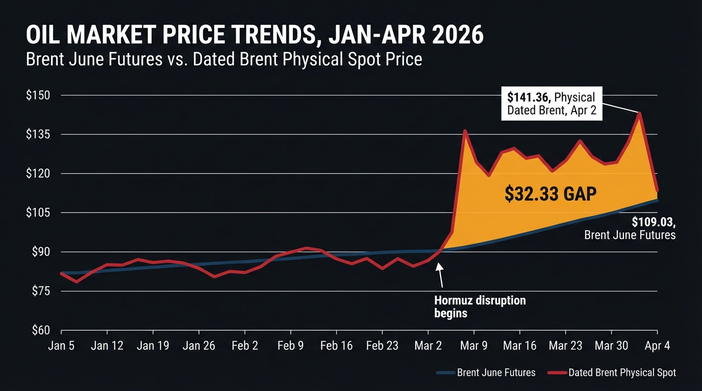 This is the story the headline misses. On April 2, physical dated Brent, the price for an actual cargo of crude loading in the North Sea, surged to $141.36. The June Brent futures contract settled that same day at $109.03