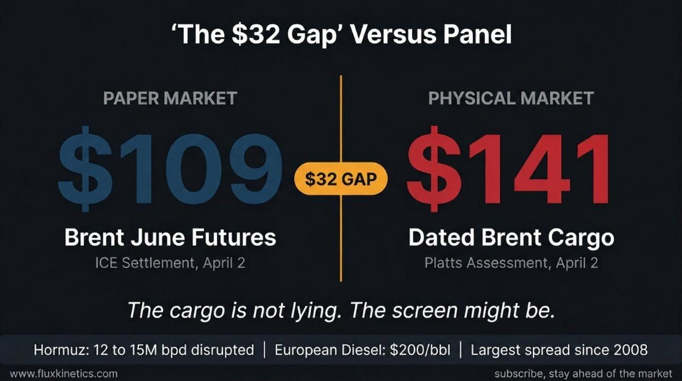 The Flux Kinetics Number: $32.33. That is the physical-paper spread on dated Brent. The largest since the 2008 financial crisis. Until this gap closes, the headline futures price is not telling you the truth about the physical market.