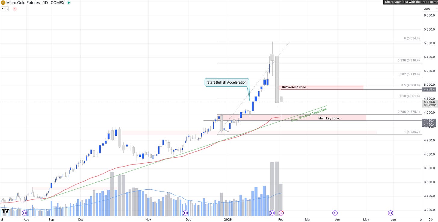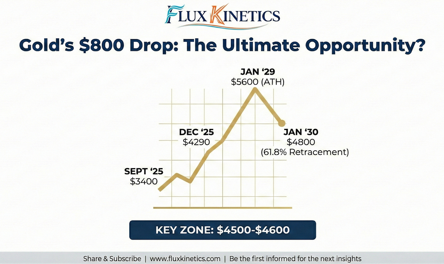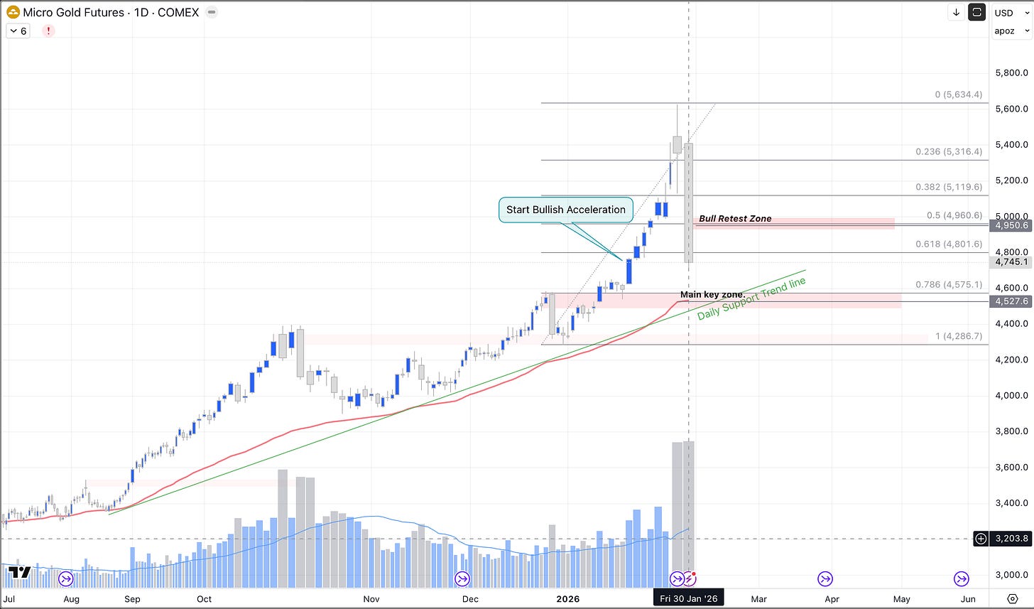 Recently, the price revisited the major resistance level at $4,600, triggering a bullish acceleration that topped out at $5,600 on Thursday, January 29. A sharp sell-off began later that same day and intensified the following day, Friday, January 30, 2026.The Friday close was $4,800, representing a 61.8% Fibonacci retracement of the bullish move that began on December 31, 2025, at $4,290.