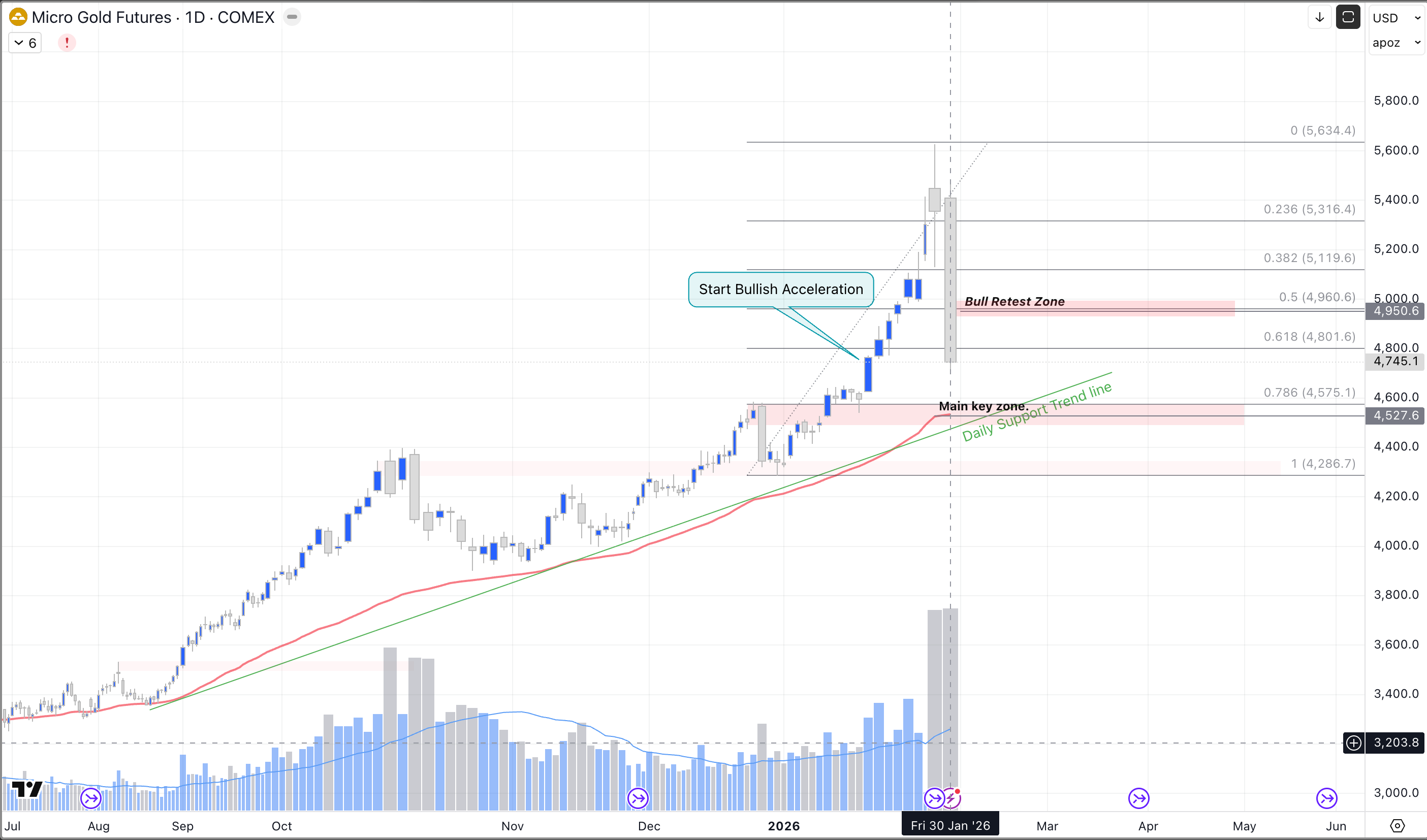 Currently, we are monitoring two main areas. The critical Main key zone is between $4,500 and $4,600, which coincides with both the 50-day Moving Average and the daily trendline support. This is a crucial “test zone” for re-entry. However, caution is required to see if bearish pressure pushes the price down for a second test of this level.