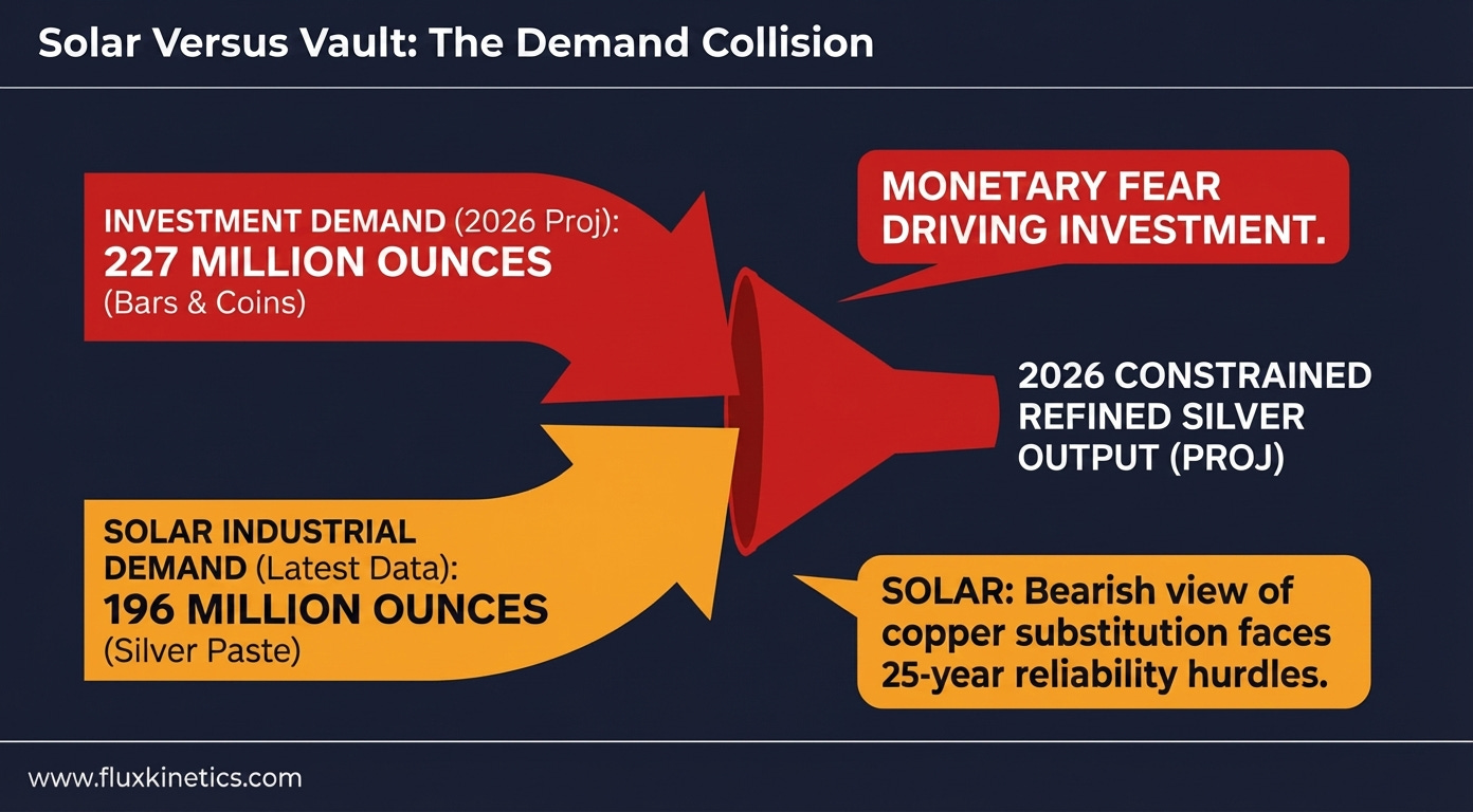Investment buying is rising too. Physical bar and coin demand is forecast to hit 227 million ounces this year. Industry and investors are competing for the same limited supply of refined silver.