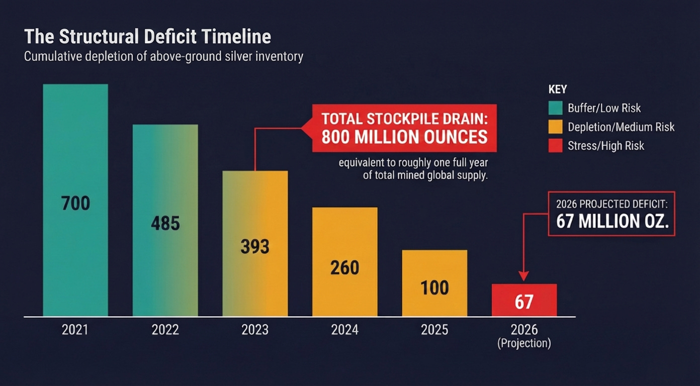 From 2021 through 2025 the market pulled more than 750 million ounces from above ground inventories. That is nearly one full year of all silver mined worldwide. Those stocks are the buffer that keeps prices from swinging wildly. The buffer is shrinking fast.