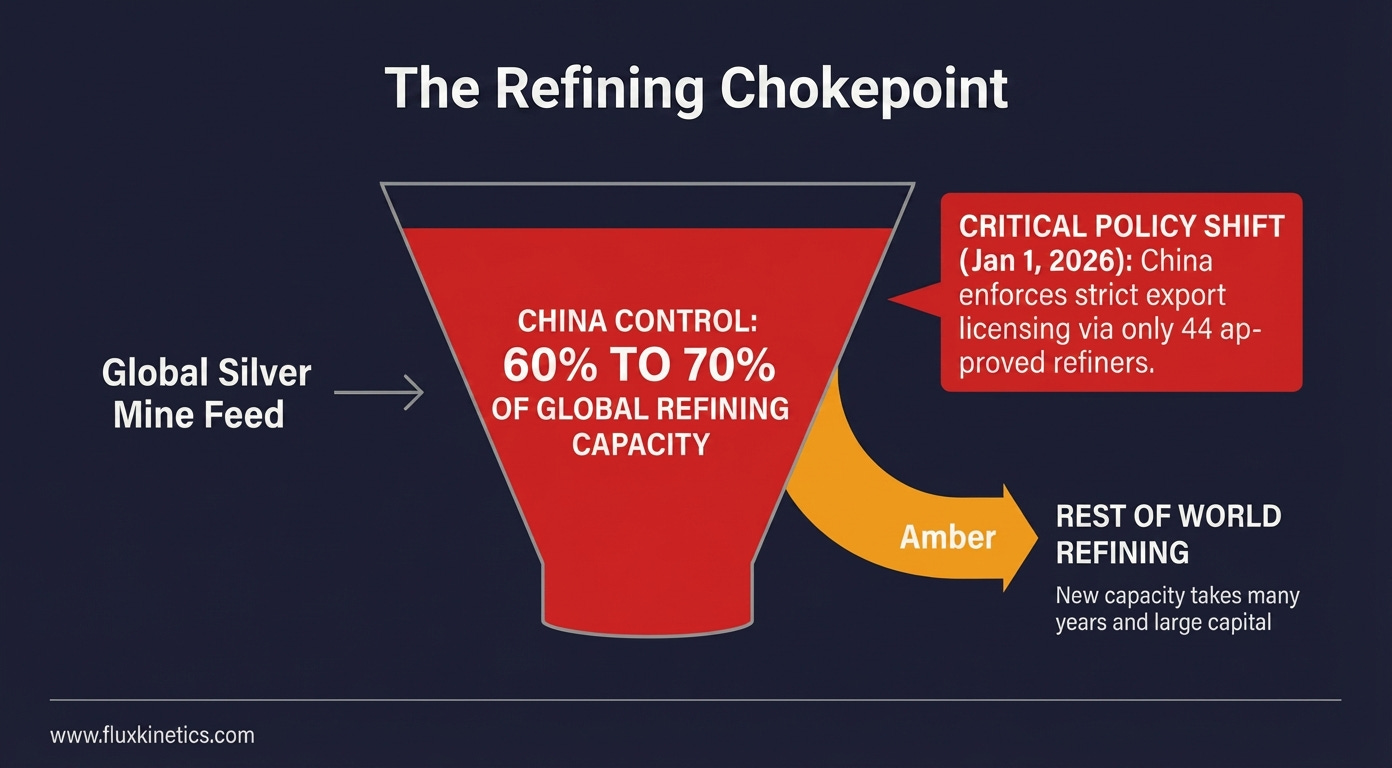 China produces up to 70 percent of the world’s refined silver. On January 1, Beijing replaced the old quota system with a strict export licensing regime. Only 44 approved companies can export refined silver now. This move treats silver like a strategic material similar to rare earths. You do not need a full ban to restrict supply. A licensing desk and a short list of names is enough.