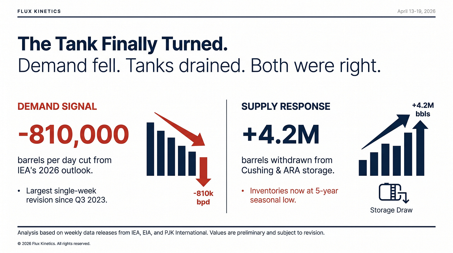 The three-week gap between paper prices and physical barrels closed this week, and it closed in the direction almost nobody was positioned for. Demand is softening. Tanks are starting to drain. Both of those are bearish flat price and both are bullish for the refiners sitting on the right side of the crack. That is an unusual setup, and it rewards precision.