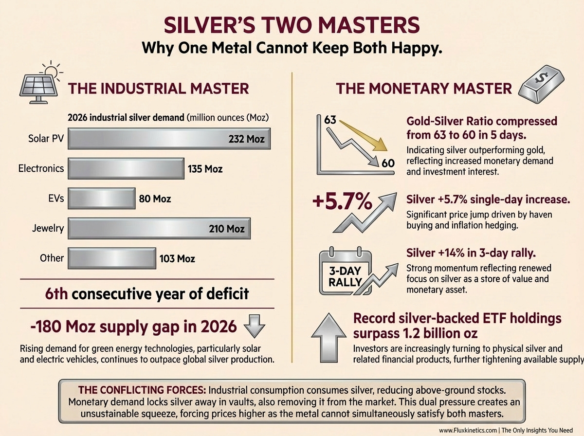 So what happens when a metal with a structural deficit also gets a monetary bid? You get what we saw this week. The gold-silver ratio compressed from 63 to 60 in five trading days, the sharpest weekly move in over a year. Silver is no longer goldâs smaller cousin. It is a supply-constrained industrial metal with a precious-metal option bolted on top. When both masters pull the same way, the move is violent. This week they pulled together, and $80 stopped being a ceiling.