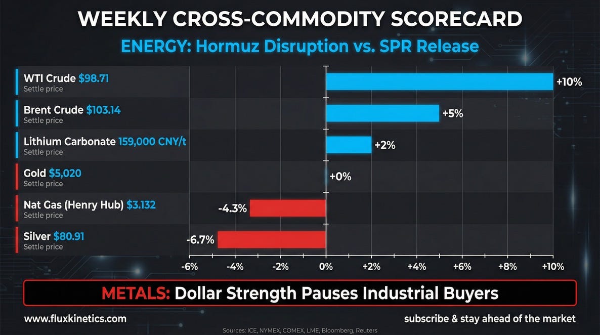 Oil: Brent settled sharply higher at $103.14 (+7.7% weekly), recovering violently from Thursday’s SPR headline as the massive $10 backwardation forced physical buyers to secure prompt supply. WTI closed higher at $98.71 (+8.8% weekly), trailing Brent as the localised influx of U.S. strategic reserves capped the domestic upside.