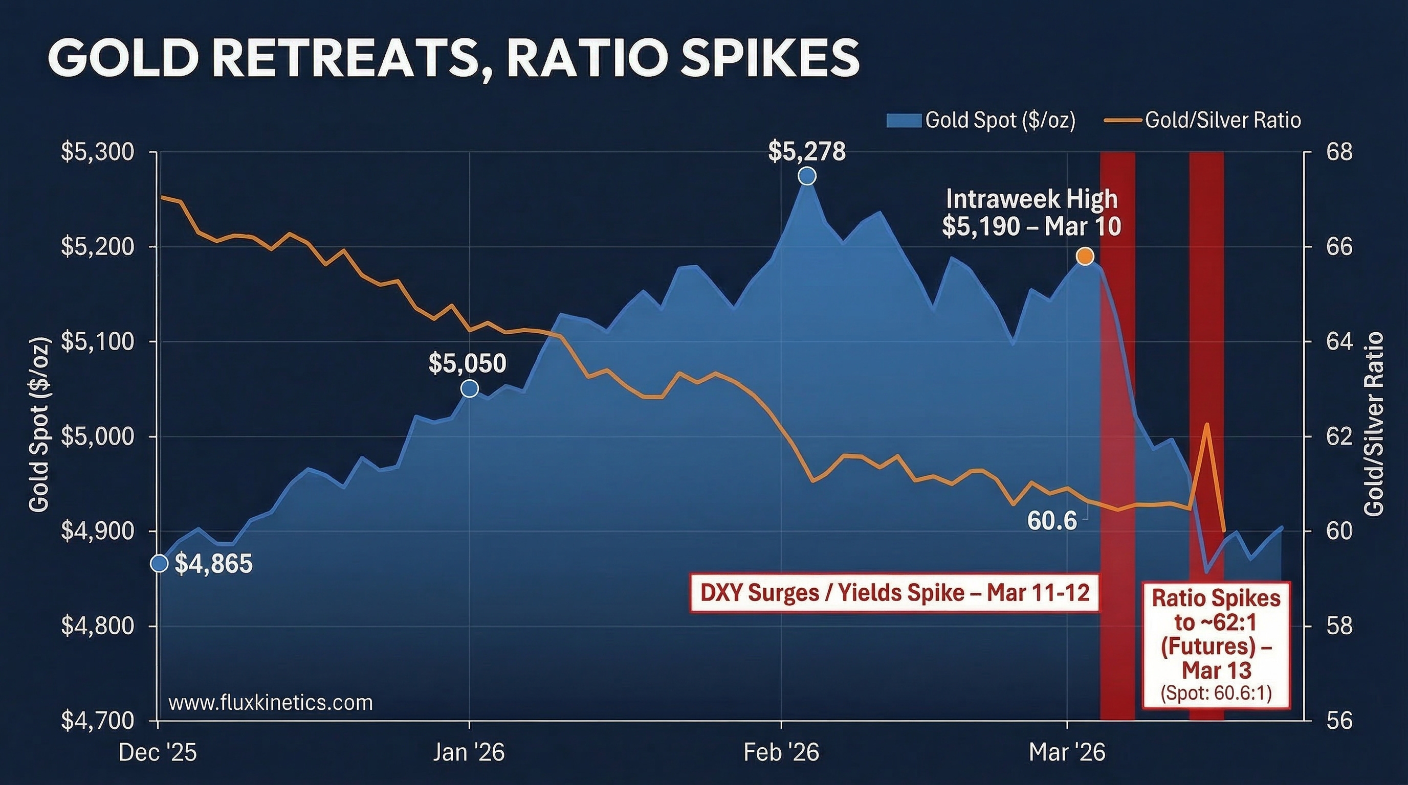 Gold: Settled lower at $5,020/oz (-2.0% weekly), testing the five-thousand floor as a surging dollar and rising real yields temporarily overpowered safe-haven physical accumulation.