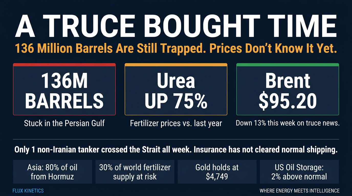 Here is the part most people missed: even with a two-week truce on paper, almost nothing is actually moving. Only one non-Iranian tanker crossed the Strait all week. Insurance companies have not given the green light for normal shipping, leaving essential agricultural inputs, along with an estimated 136 million barrels of oil and fuel products, physically trapped in the Persian Gulf.