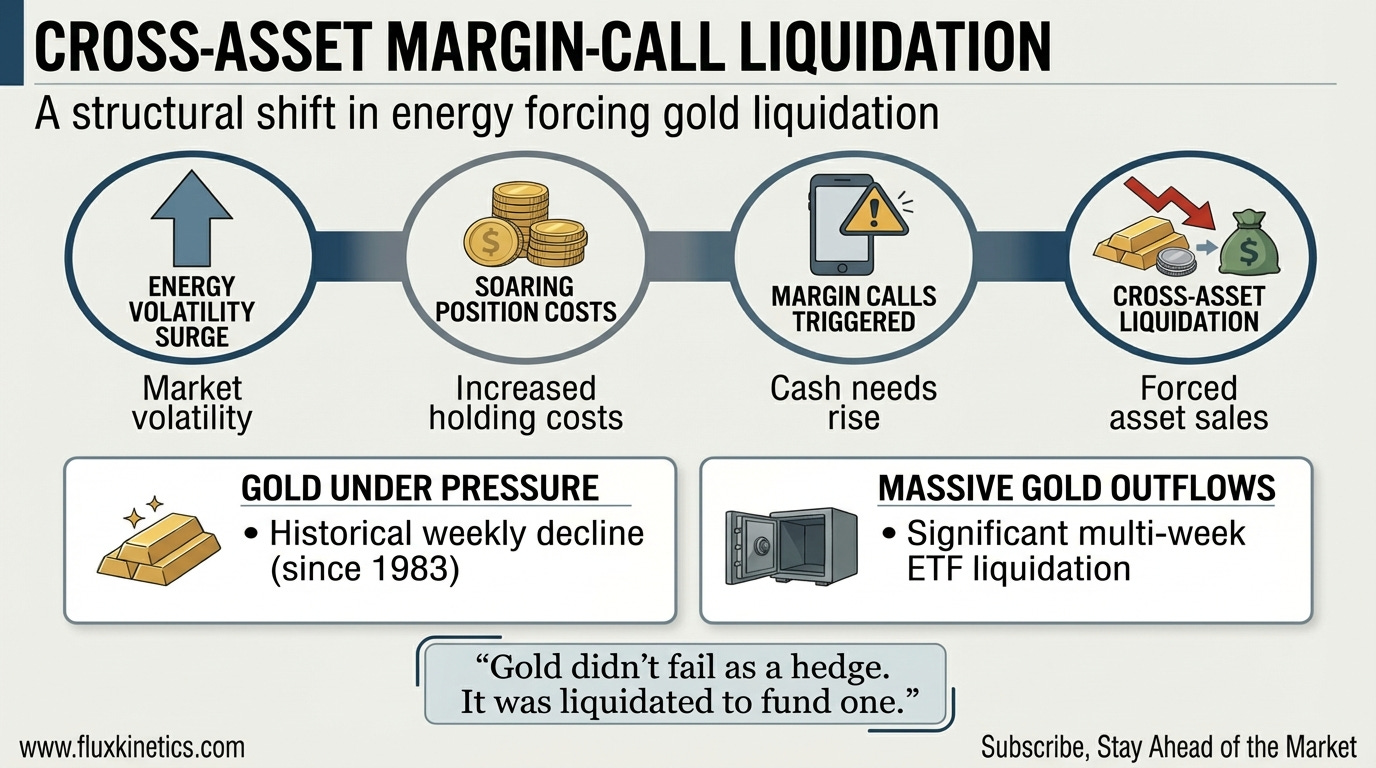 Here is what almost everyone missed. Gold had its worst week since 1983. Down over 10%. At the same time oil was surging to multi-year highs. That is not risk-off. That is a margin call. US gold-backed ETF holdings dropped 30 tonnes in a single week. The energy complex got so expensive to hold that it started pulling cash out of everything else. Gold is liquid. Gold got sold.