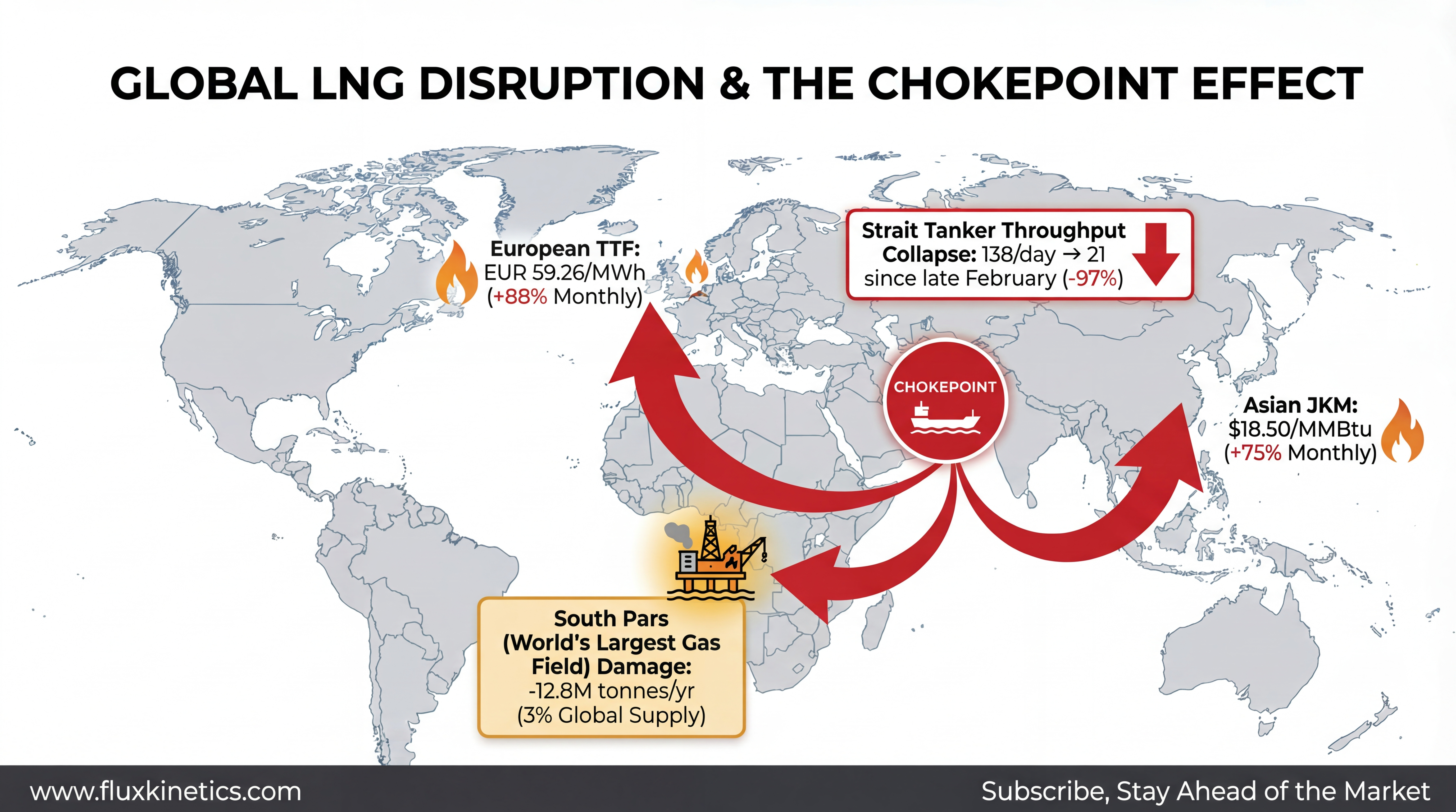 European TTF surged to EUR 59.26/MWh. Up 88% month-over-month. Asian JKM pushed toward $26/MMBtu.
