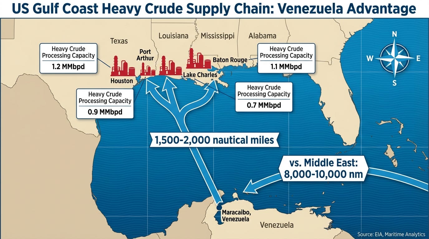 Chevron, the only US major currently operating in Venezuela under Treasury Department waiver, ships approximately 120,000 to 150,000 barrels per day to Gulf Coast refineries. That’s a rounding error in global terms but a significant margin input for specific refining assets optimized for heavy crude processing. The geographic advantage is substantial: Venezuelan crude reaches Gulf Coast refineries in 1,500-2,000 nautical miles compared to 8,000-10,000 nautical miles from Middle Eastern suppliers.
