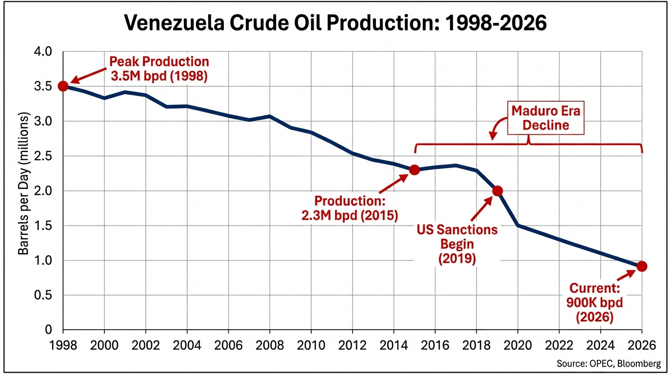 The production collapse tells the real story. From a peak of 3.5 million barrels per day in 1998, Venezuela’s output has cratered by more than 70%, a decline unprecedented among major oil producers outside of active war zones. Decades of mismanagement, underinvestment, corruption, and sanctions have turned the world’s largest oil reserves into one of its least productive assets.