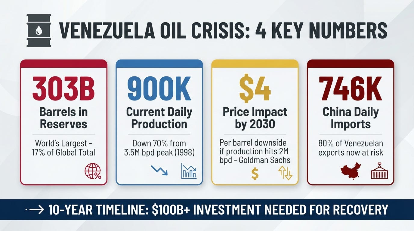 The real question isn’t whether Venezuela matters to global oil supply. With current production hovering around 800,000 to 1 million barrels per day, less than 1% of global output, the immediate supply disruption is negligible. What matters is the long game, and right now, the math doesn’t favor bulls expecting a quick recovery that props up crude prices.