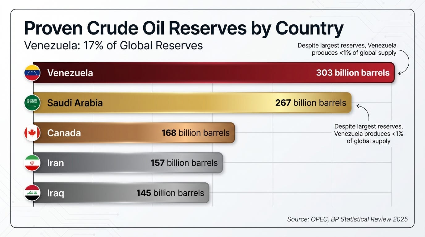 Venezuela sits on 303 billion barrels of proven reserves, the largest in the world, exceeding even Saudi Arabia’s holdings and representing roughly 17% of global proven reserves. For context, that’s more crude underground than Russia and the United States combined. Yet despite this geological windfall, the country currently produces roughly the same daily volume as Romania.