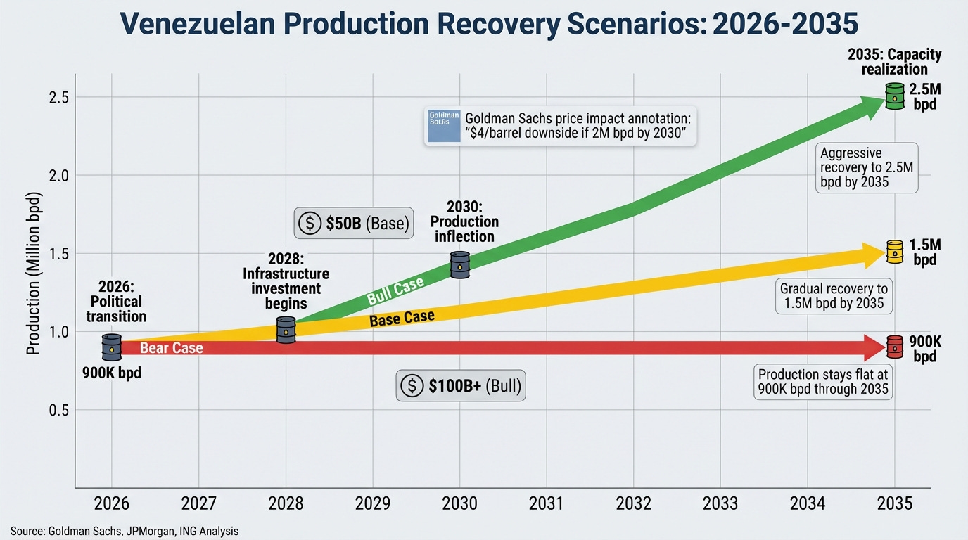 Long-term (2028-2035): The structural supply risk materializes. If $50-100 billion in investment flows into Venezuelan infrastructure, requiring both political stability and attractive fiscal terms for international oil companies, production could scale toward 2-2.5 million bpd. That volume, entering a market already facing demand headwinds from electrification and efficiency gains, creates persistent downward pressure on crude prices.