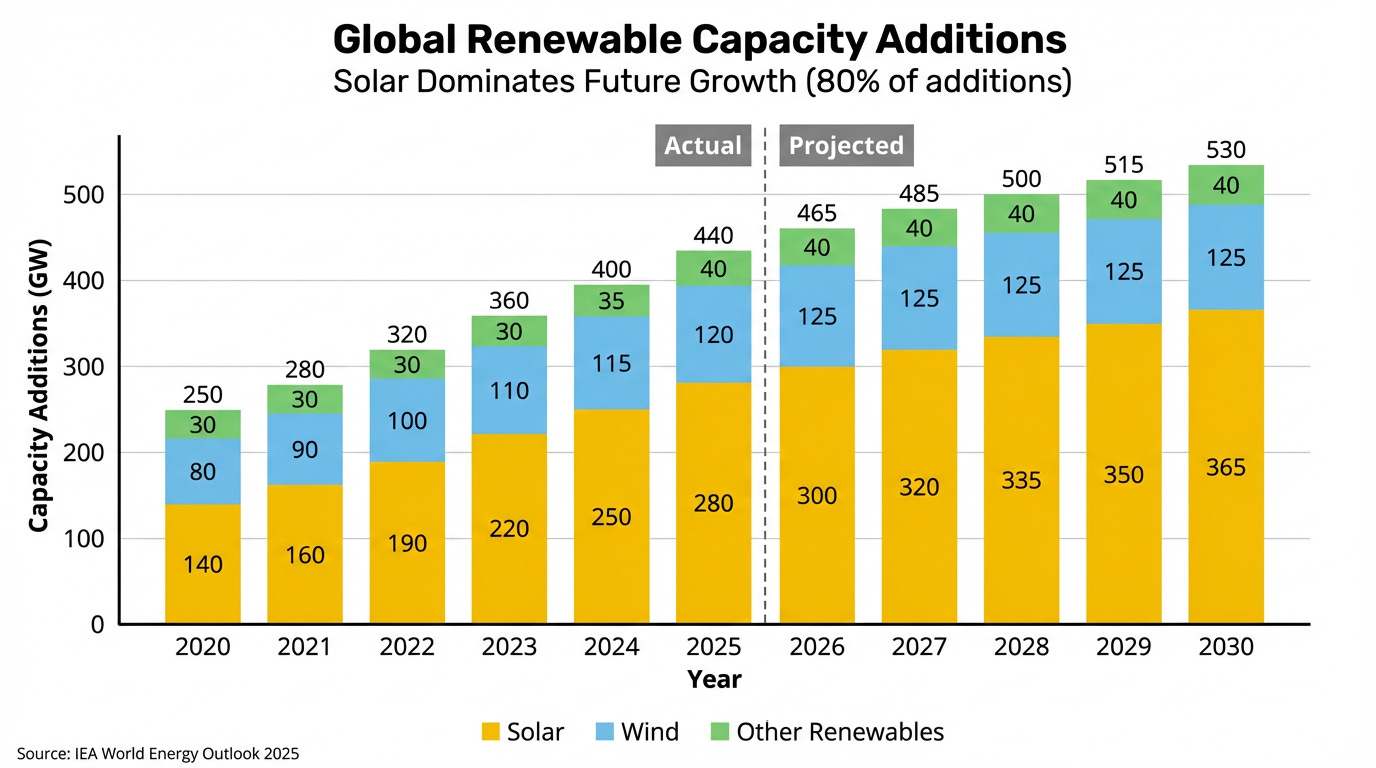 Despite these headwinds, renewable capacity expansion continues albeit at a moderated pace. The IEA reduced its global renewable capacity forecast through 2030 by 20% versus prior projections. Yet it still anticipates 4,600 GW of additions by decade-end, with solar representing approximately 80% of new capacity.